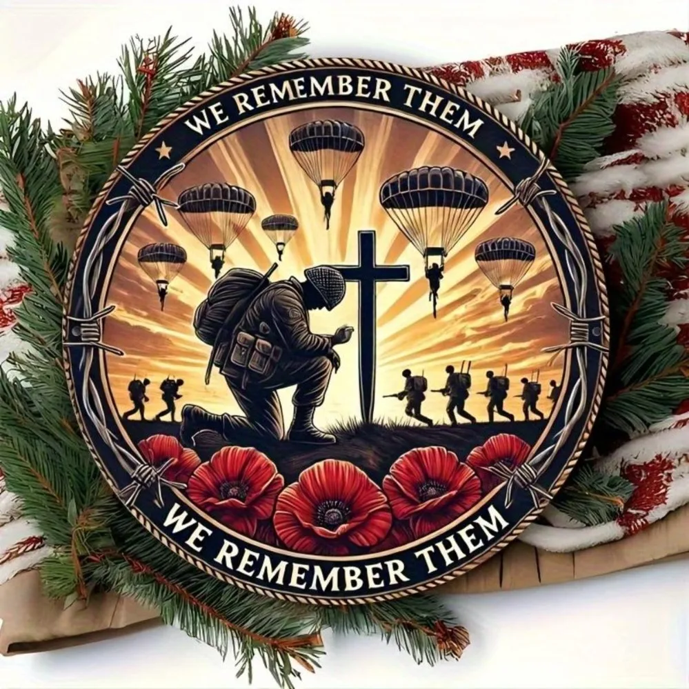 "We Remember Them" Metal Wall Wreath (1 Piece) – Vintage Soldier & Poppy Themed Decorative Art, Long-Lasting Aluminum Sign, Ideal for Home